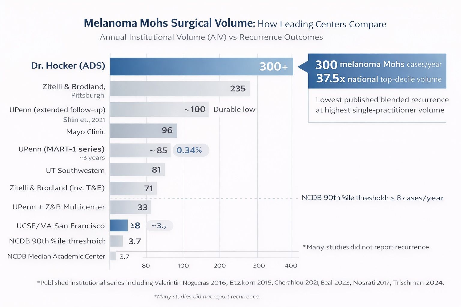 ● Dr. Hocker performs 300 melanoma Mohs cases annually — 37.5× the national top-decile facility threshold.